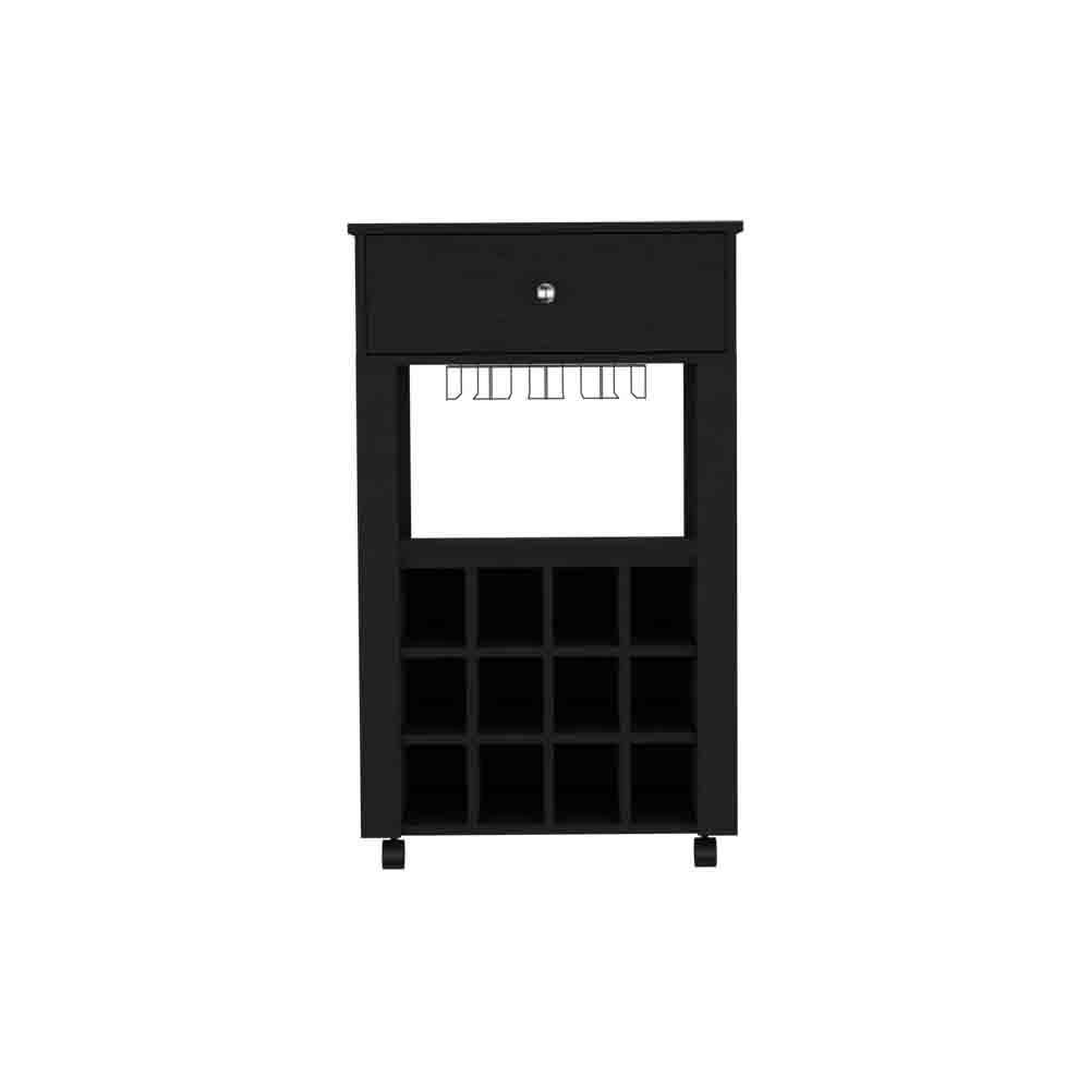 Bayamon Bar Cart, if you enjoy wine and want a contemporary setting in which to store your favorite bottles and glasses, this bar has both. It includes twelve compartments (4''W X 4,7''H) for keeping your wine organized and fresh, as well as the capacity to store your glasses, as well as a huge drawer and caster (2,2'') for improved movement and adaptability. Designed with elegant Black manufactured wood finish.Dimensions:Height: 39,37" Width: 23,62' Depth: 13,98 'Furniture Type: Ready to assemble (full assembly required) Certifications: CARB phase II compliant – TSCA Title VI Compliant.Warranty: 1-year warranty coverage in wooden parts 1-year warranty coverage in hardware pieces since its manufacturing date is found in the lot number printed in the product box.Shipment details: Free shipping to the 48 contiguous states delivery time: Between 2 and 5 days depending on the customer's location, season, and weather factors. Other details: This product does not include decorative or background elements; Check that the box is in good condition, and well packed, and check with the help of the manual that the corresponding parts have been included; For more information regarding warranty, shipment details, cancellations, returns & replacement parts go to the bottom section of our website to learn more; Installation & Assembly Instructions included.